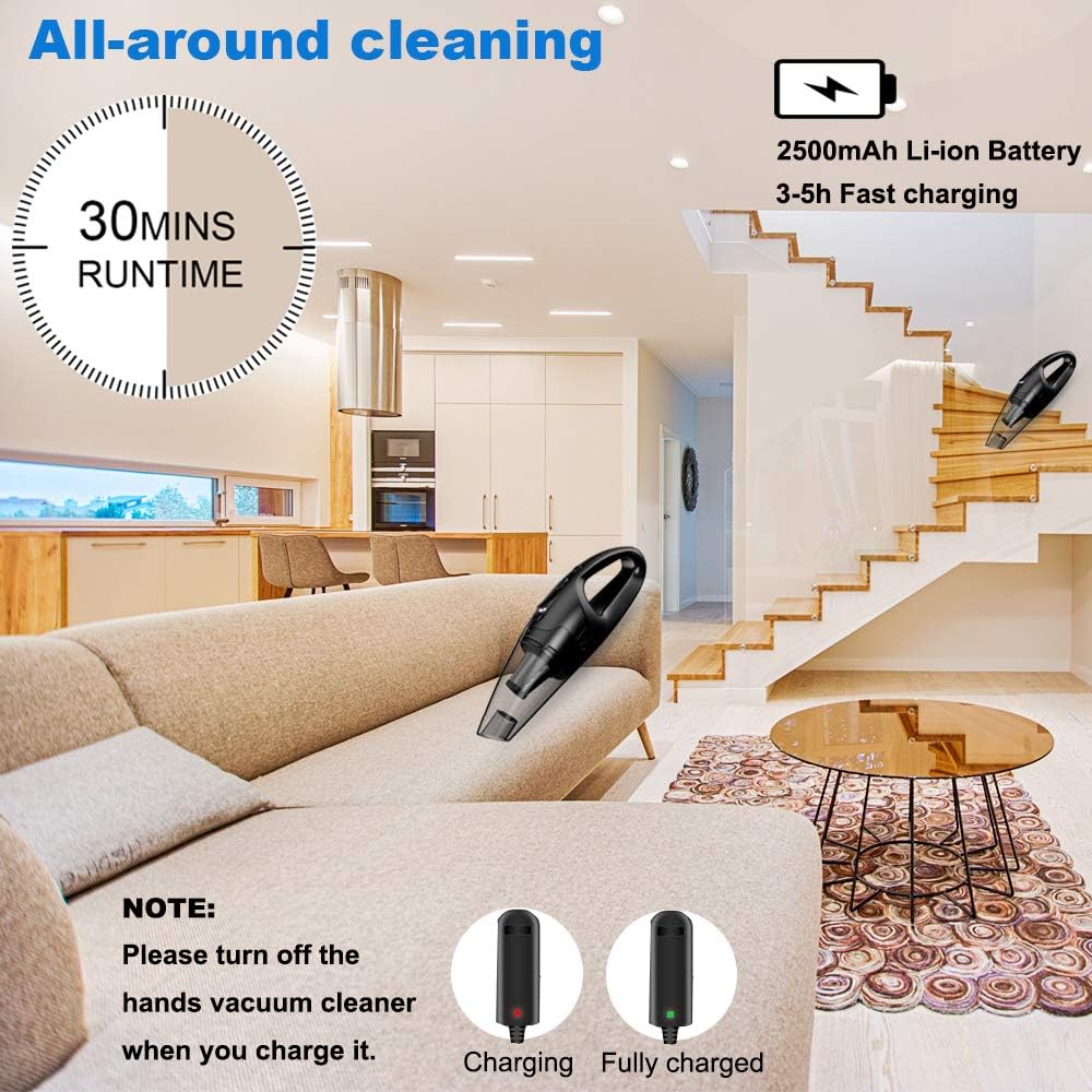✶ℳ2500mAh Batterie Li-ion Ricaricabili e luce a LED -👍- NINNA aspirabriciole senza fili, con una premium batteria al litio, può garantire una lunga autonomia d'uso da 20-30 minuti. (La batteria agli ioni di litio ad alte prestazioni da 2500 mAh offre fino a 30 minuti di funzionamento, può pulire l'intera casa senza ricaricare.)Grazie al sistema di ricarica rapida, per caricare completamente la batteria, ci vogliono solo 3-5 ore. Ninna l'aspirapolvere portatile è dotato di una luce a LED